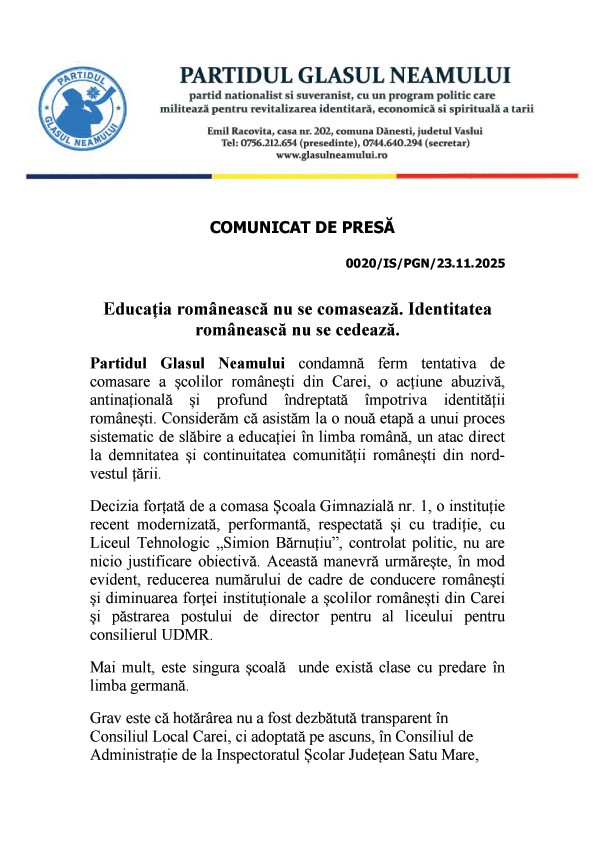 Partidul Glasul Neamului condamnă ferm tentativa de comasare a școlilor românești din Carei, o acțiune abuzivă, antinațională și profund îndreptată împotriva identității românești.